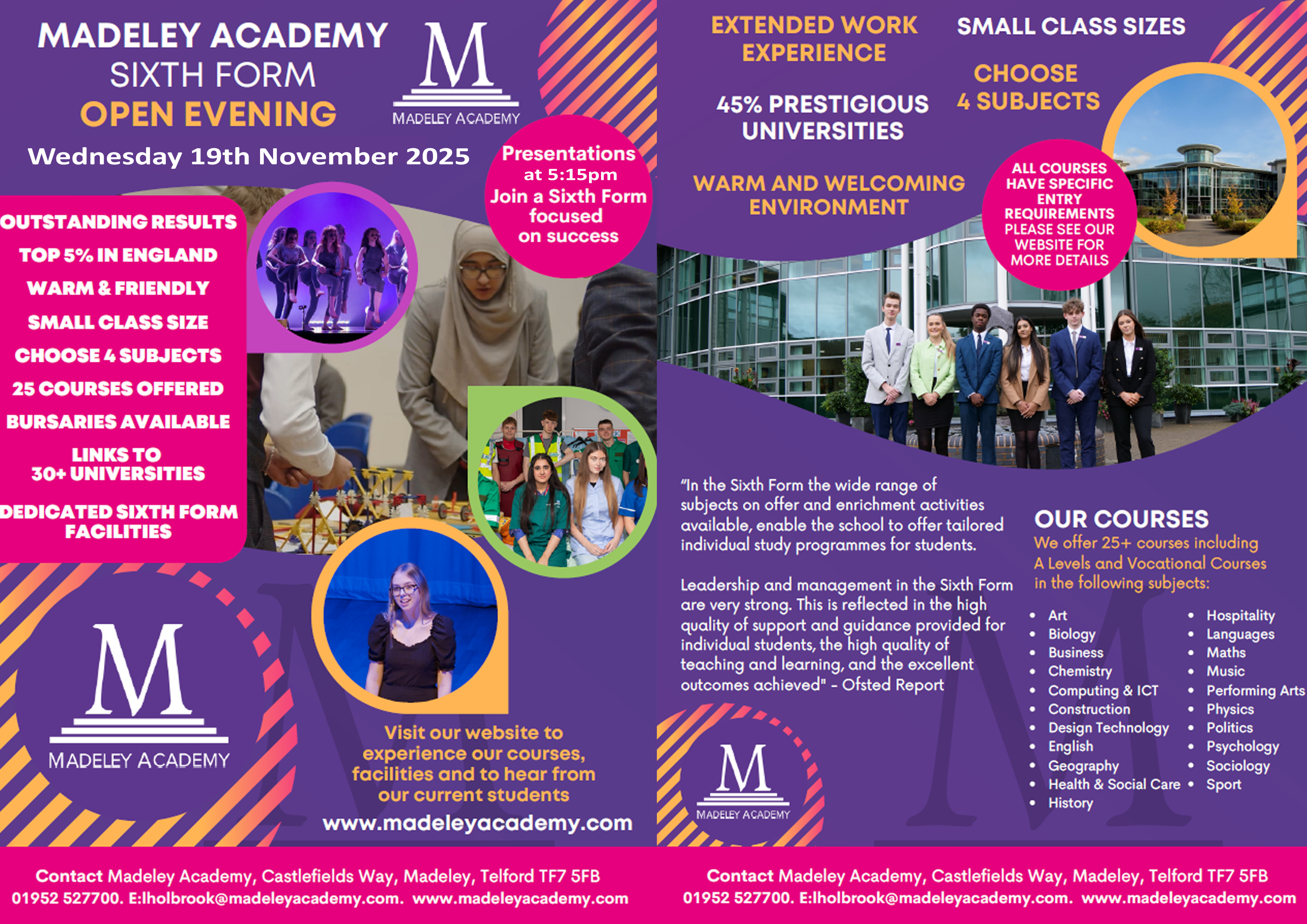 The 2025 Madeley Academy Sixth Form Open Evening for prospective Year 12 Students will take place on Wednesday 19th November from 4:30-6:30pm.
